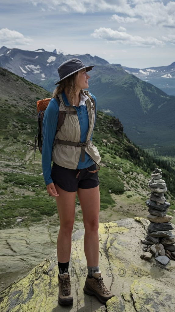 For high-energy hikes, a fitted crop top, lightweight shorts, and sturdy sneakers are must-haves. A backpack is essential for carrying essentials, and a hat provides sun protection while elevating the overall aesthetic. This outfit is perfect for those who love active, fast-paced hiking adventures. Wear hiking socks to prevent blisters and add ankle support for stability on uneven terrain.
