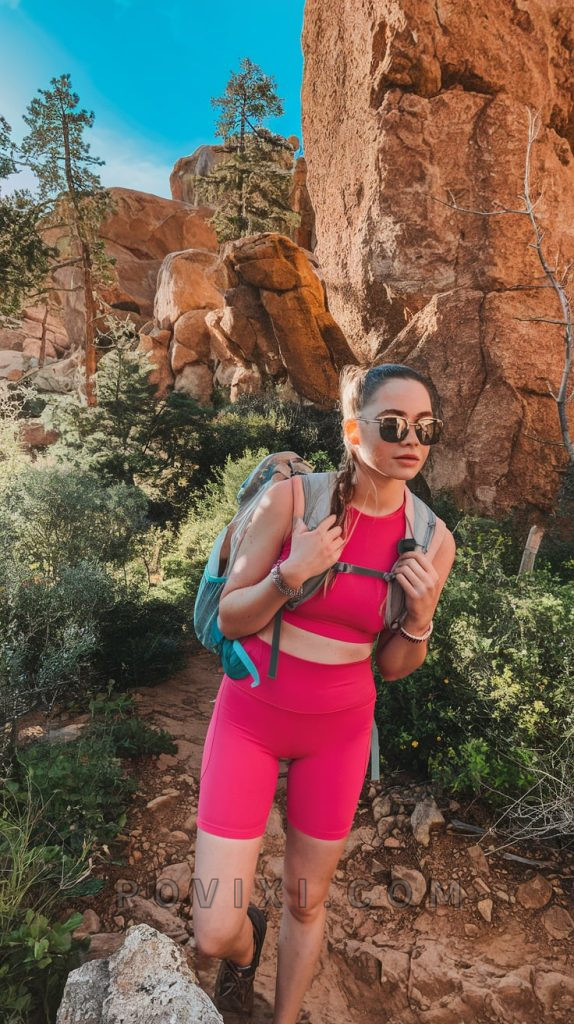 A monochrome pink workout set brings vibrancy to the trail. The fitted leggings and crop top provide excellent flexibility, while the backpack ensures convenience for long hikes. Accessories like hats or scarves can be added for sun protection, making this an excellent summer choice for outdoor adventures. Invest in UV-protective clothing to shield your skin from harmful rays while hiking in hot weather.
