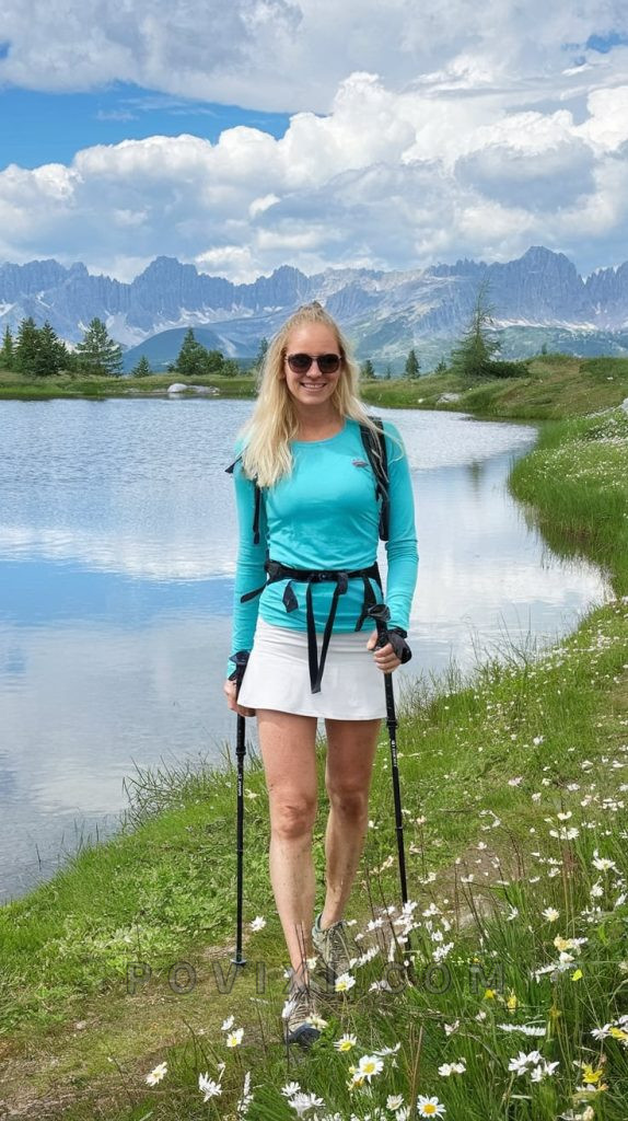 Who says you can’t hike in a skirt? This hiker rocks a light white skirt with a turquoise long-sleeve top, proving that feminine and practical can coexist. The hiking poles add support on uneven terrain, while the sunglasses bring a stylish finish. This look is perfect for plus-size women who want a breezy, non-restrictive fit. Choose skirts with built-in shorts or pair them with leggings for added comfort and coverage on longer hikes.
