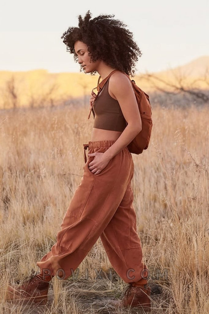Perfect for desert or grassland hikes, this outfit features breathable earth-toned joggers paired with a brown crop top. The backpack complements the outfit, making it functional while maintaining an aesthetic that blends into natural surroundings. Pair this look with scarves for an added layer of protection from dust and sun exposure.