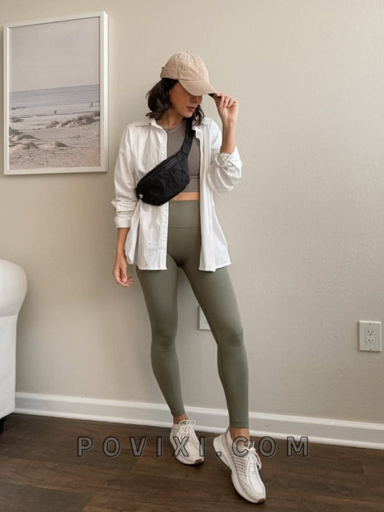 For those who enjoy the trail for women that blurs the lines between nature and city life, this outfit is the ultimate blend of sportiness and streetwear. A neutral-tone cropped sports top paired with olive-green leggings creates a streamlined, size-inclusive look that flatters all body types. A lightweight white button-up shirt serves as the perfect layering piece, offering sun protection without overheating. The addition of a crossbody bag keeps essentials within reach, while comfortable sneakers ensure all-day support.