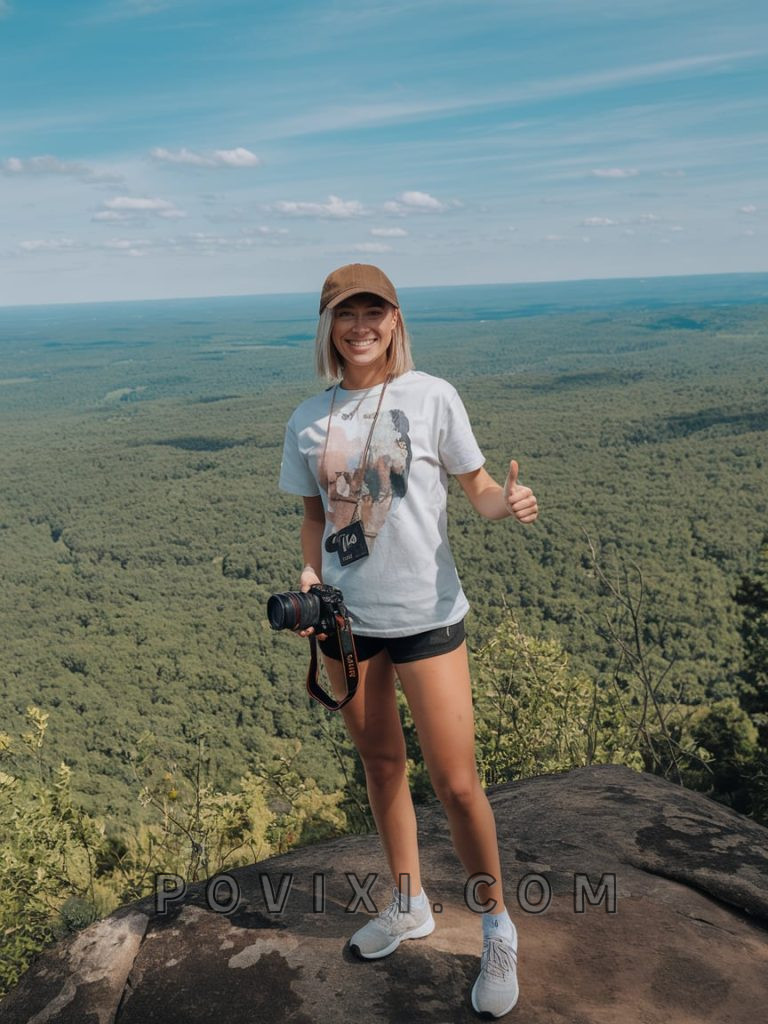 If you’re drawn to cute, sporty outfits that mix adventure with fun, this one’s for you. A graphic T-shirt tucked into black athletic shorts makes this a go-to beach or trail outfit. Perfect for hot summer hikes, this look is lightweight, comfortable, and effortlessly stylish. The standout elements here include a neutral cap, which provides much-needed sun protection, and white sneakers designed for active movement. A professional camera hanging from the neck suggests that this outfit is made for capturing memories while exploring nature.