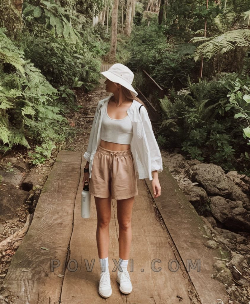This aesthetic ensemble features earthy neutrals, a relaxed button-up shirt, and breathable shorts—ideal for jungle or forest trails. White sneakers complete the casual and modest vibe, making it a great trail for women looking for both comfort and style. The loose-fitting outfit allows for excellent airflow, keeping you comfortable even in humid conditions. Wear a hat or a scarf to protect yourself from insects while hiking in dense forests.