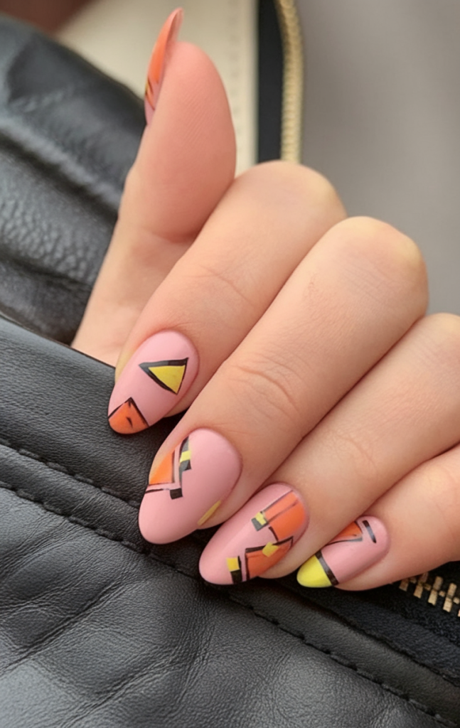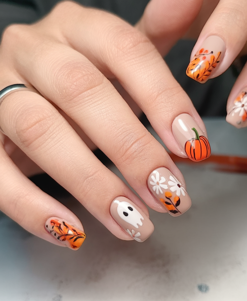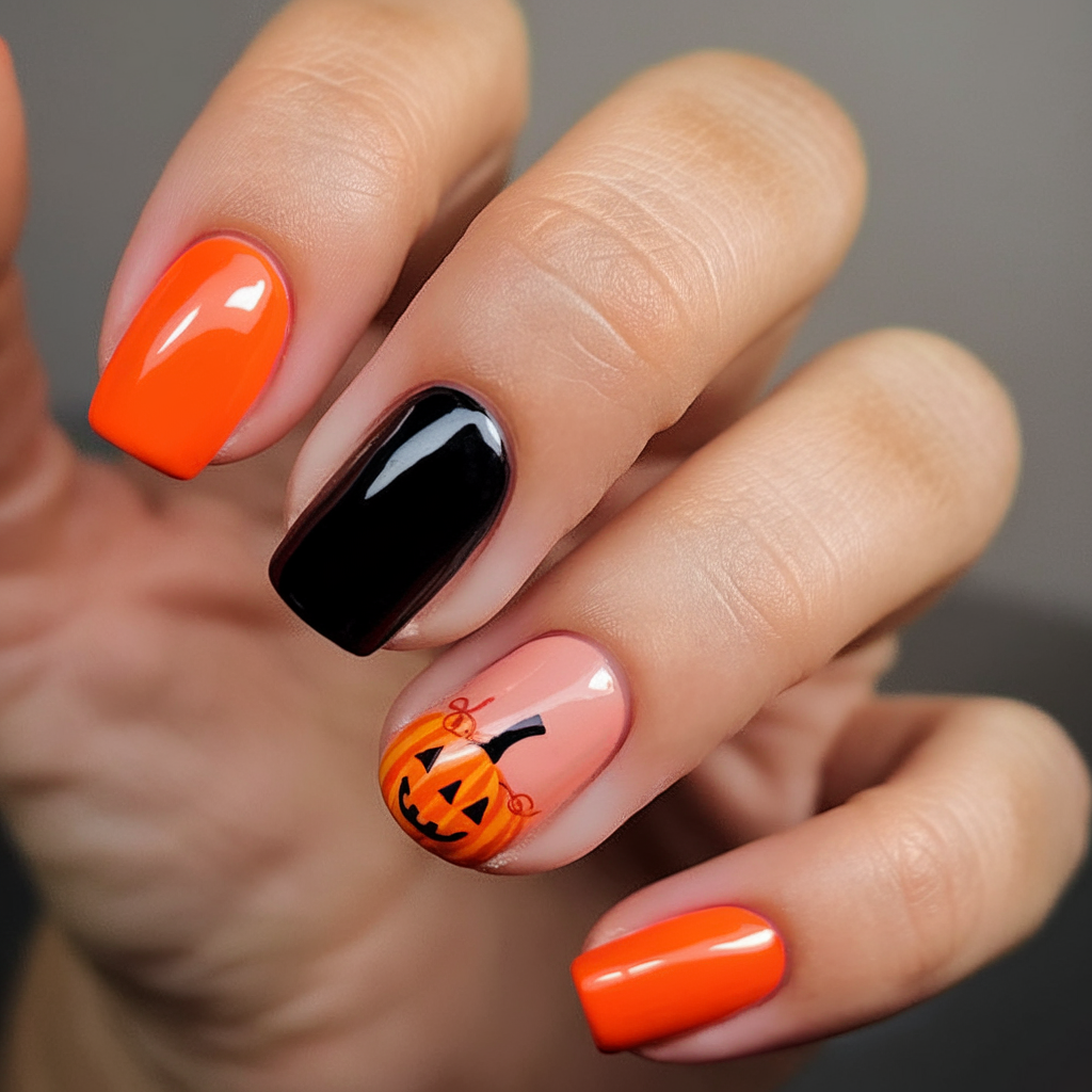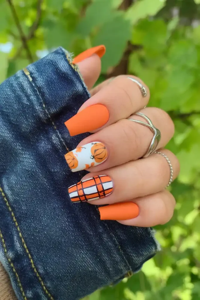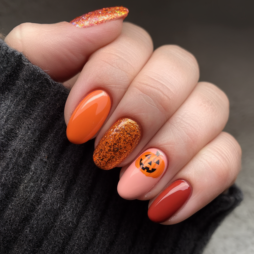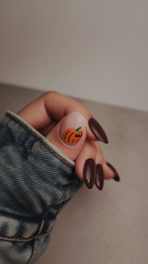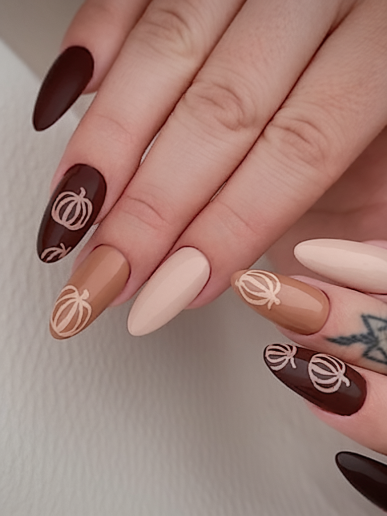 This set is the best with short-medium almond nails and is much more modern fashionable looking as compared to other sets featured. It is a classy move in embracing pumpkin nails ideas 2025 without being tied down to the common rules.