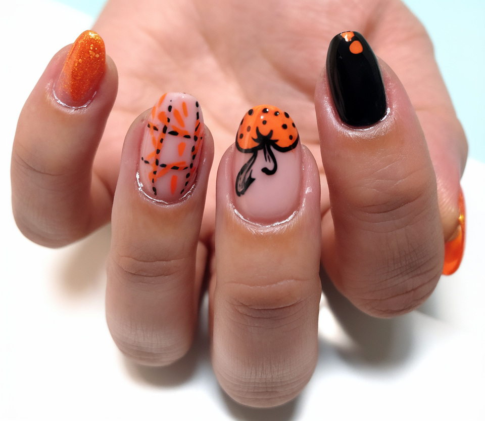 This creation cuts the middle towards the halloween sides with glossy and high finish of orange and black coupled with a nude base and a saucy pumpkin center. It is a graphic, clean aesthetic that is both classic and contemporary at the same time that has a touch of Halloween, but stylish.