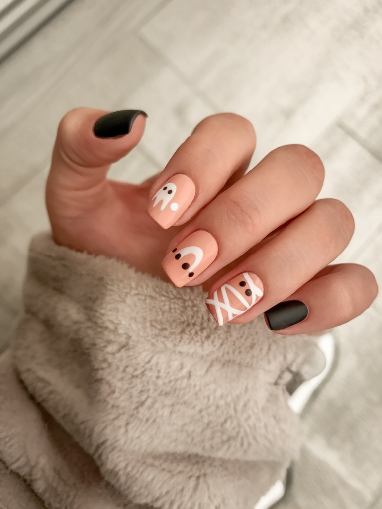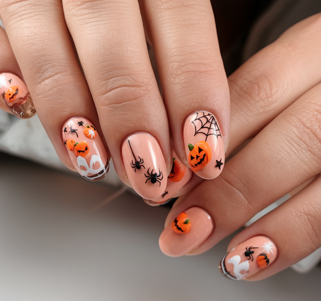 These nails are nothing but a party in the Halloween on your fingertips. It contains pumpkins, ghosts, spiders, webs, and floating stars making it a complete celebration of spooky season. Juxtaposed against the busy art with the peach backgrounds, the latter mellow out the former, the art takes a sweet animated approach, such as stickers of your best Halloween-time-memoried book come to life.