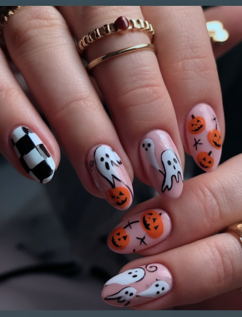 It is a design that is taking Halloween to the next level: there are floating ghosts, grinning pumpkins, and brave checkered decorations that are artistic in the sense of chaos and cuteness. It is hectic in a good way like sprinkling confetti at a costume party. It has a soft pink background to keep it down to earth and the sharpness of the black and orange carries off its it festiveness.