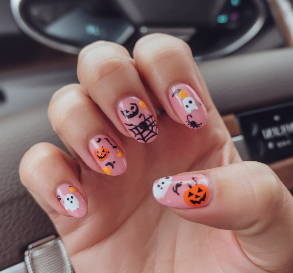 Pretty and eccentric come together on this pink centered design, stuffed to the brim with traditional Halloween symbols of ghosts, spiders, moons and oh, lots of other cheeky little pumpkins. The hollow background lets the light in the playfulness details and makes your nails look like little Halloween storyboard. The experience is like putting on a celebratory sticker pack but much more sophisticated.
