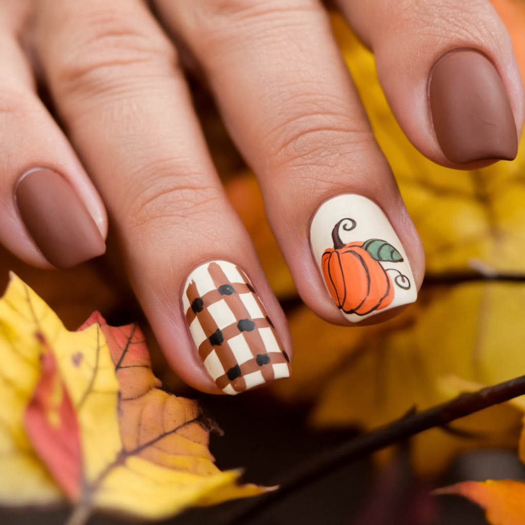 Such a fall nail art is your go-to comfy flannel shirt and latte to go. The high-quality brown matte color goes so well with the warm plaid and pumpkin accent, to present that rustic chic to make the crisp autumn day just as beautiful to look. The creamy pumpkin on a soft base brings a handcrafted, almost vintage feel — like something you’d spot at a local harvest festival.