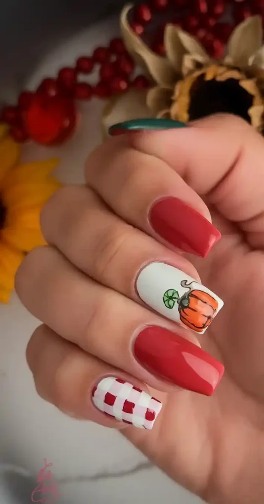 The serious retro-diner-meets-thanksgiving vibes that this vibrant red and white gingham design gives off are certainly working out. Pumpkin detail is providing the correct touch of fall desideratum to render this set a daring, unconventional change of classic pumpkin nails ideas 2025. It has the glossy look that is refined and new- it is a new coat of lipstick at its best.