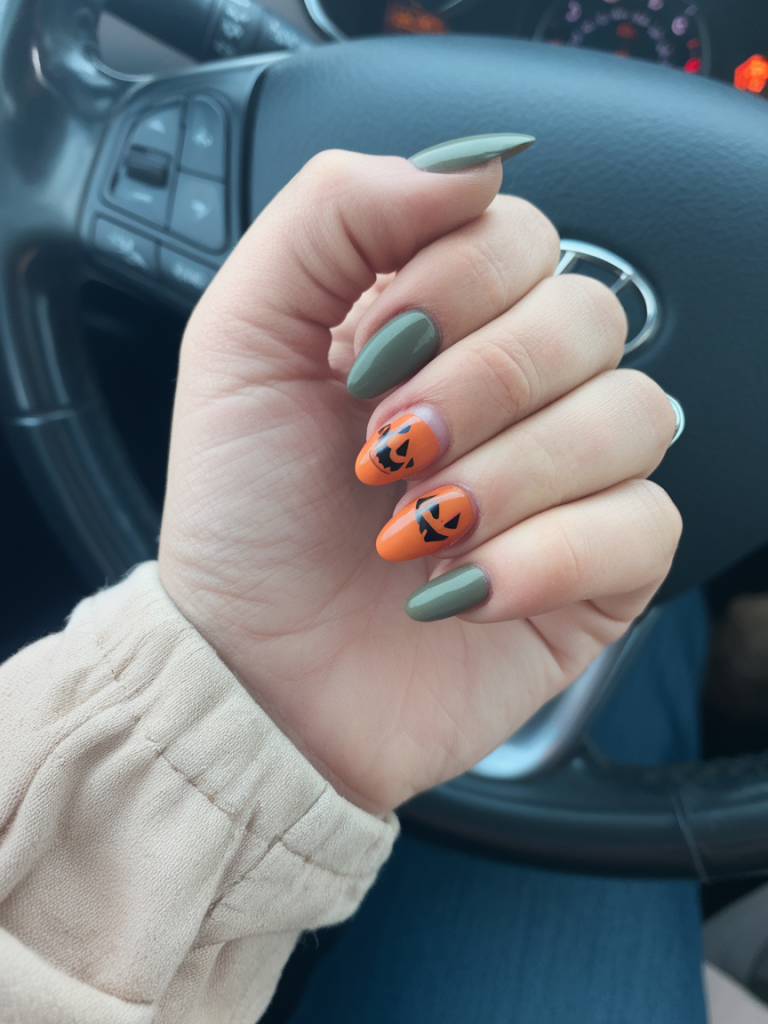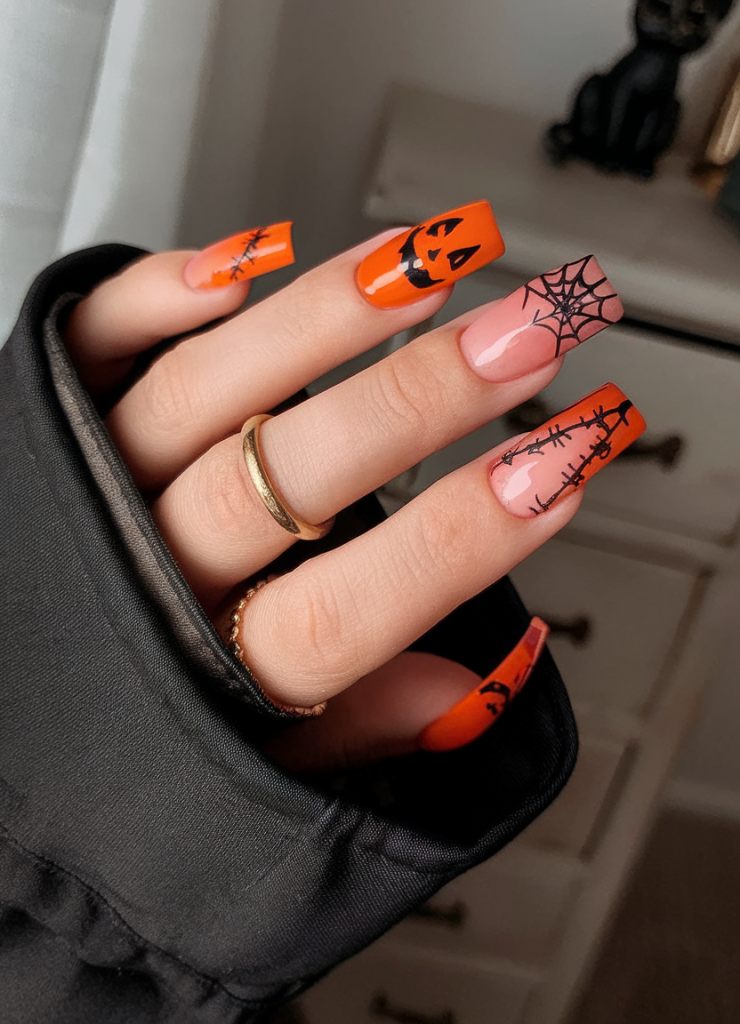This is the design to go all out this October, especially in case you are seeking inspo. This fits perfectly on acrylic or gel almond nails and it is best suited to the women who prefer to be different and go all the way into the halloween spirit. Put on your witch hat and these nails will tell the difference.