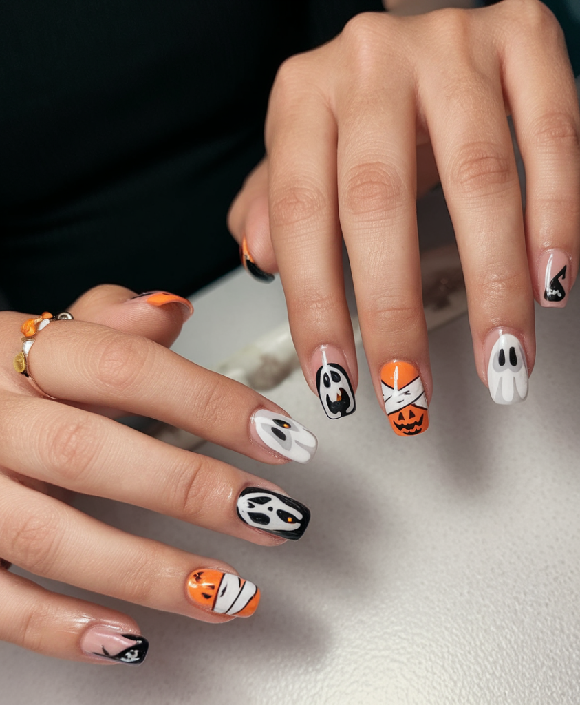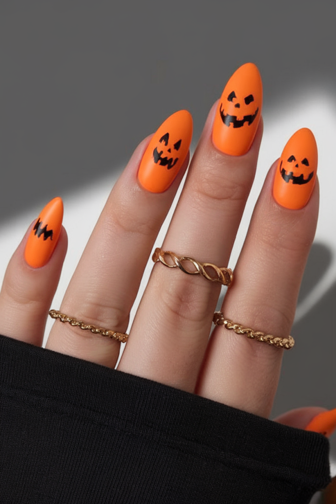 Perfect for acrylic almond nails or natural long shapes, this look is for anyone who loves bold seasonal art and isn’t afraid to have fun with their nails. It is a giddy way to express your Halloween spirit and still be stylish in 2025.