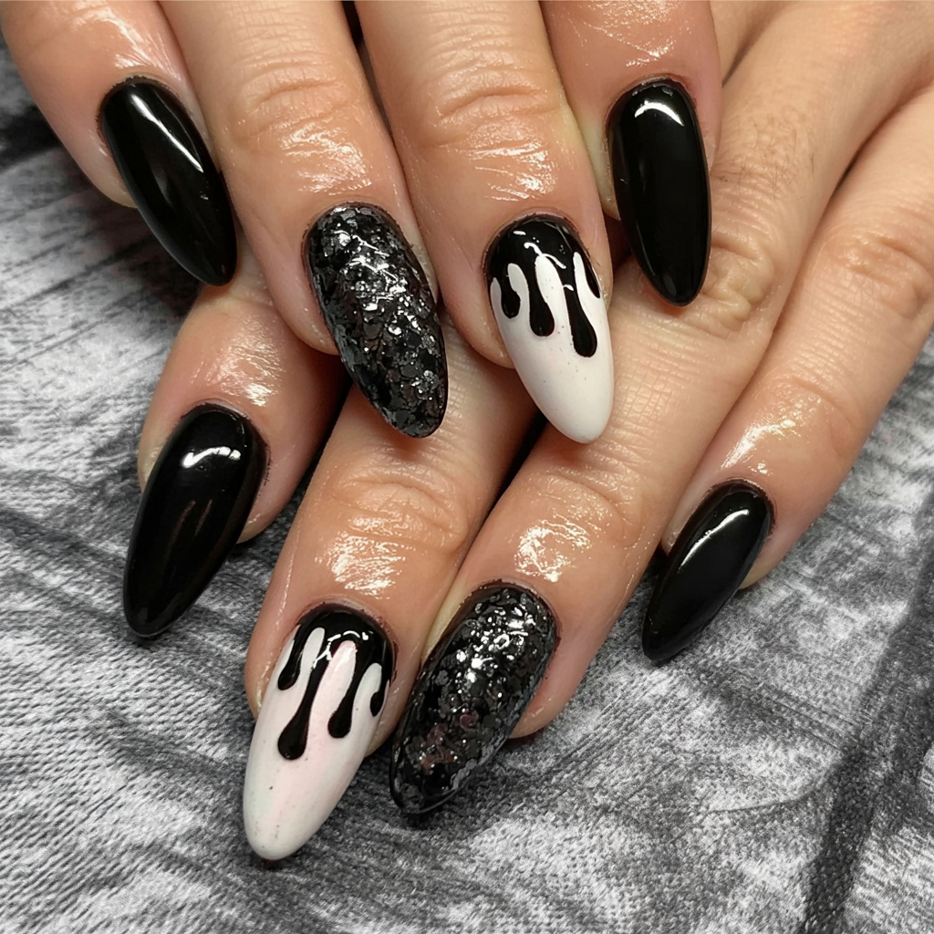 Big, creative and somewhat subversive- this nail pack is for anyone looking to have fun. Between the high-gloss black, the shimmering texture, and the playful drips, there’s so much personality packed into every fingertip. It’s glam with a gothic twist.