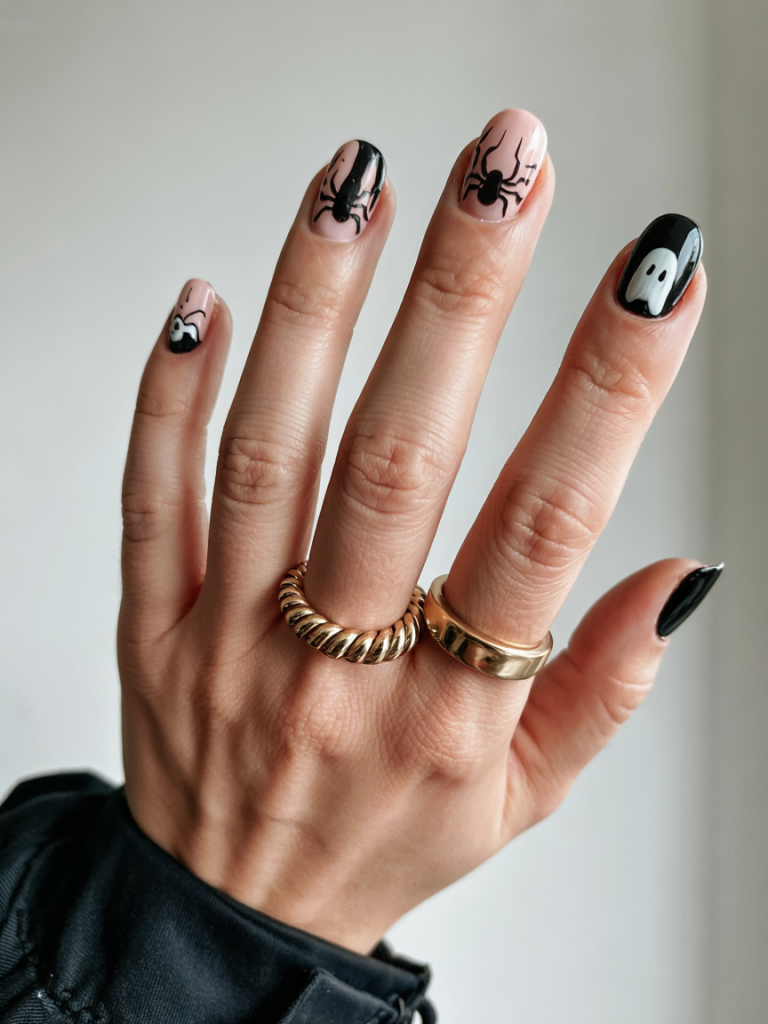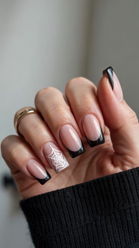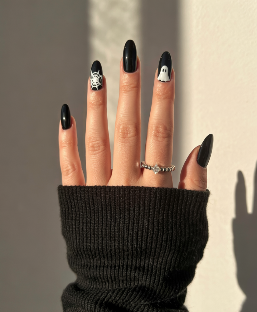 16. Candy Black Nail Polish with Ghost and Web Motif