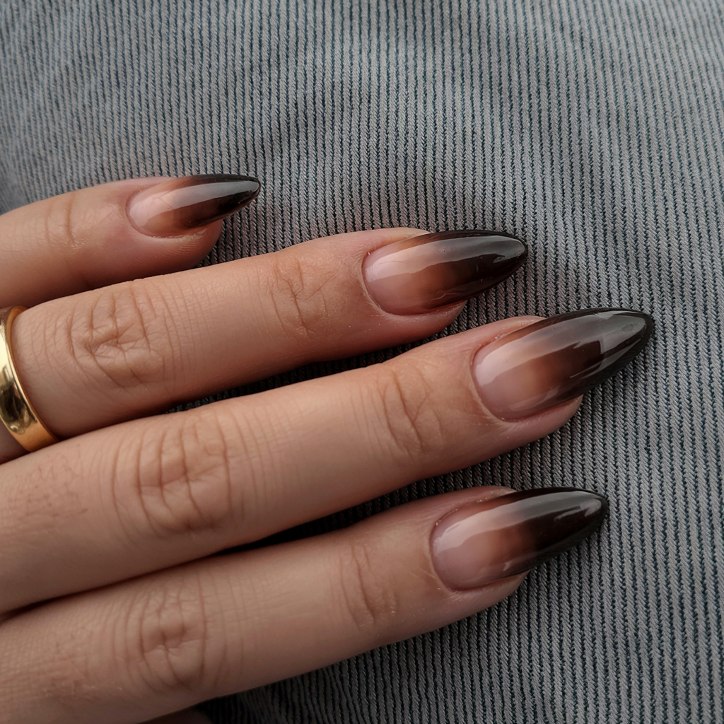 It is a smoky ombr in which you can not resist reminding yourself of your favorite sweater at fall–dramatic, cool, and soft. The graduation of the clear nude to and the dark black is smooth providing the shadow effect that appears mysterious and chic at the same time.