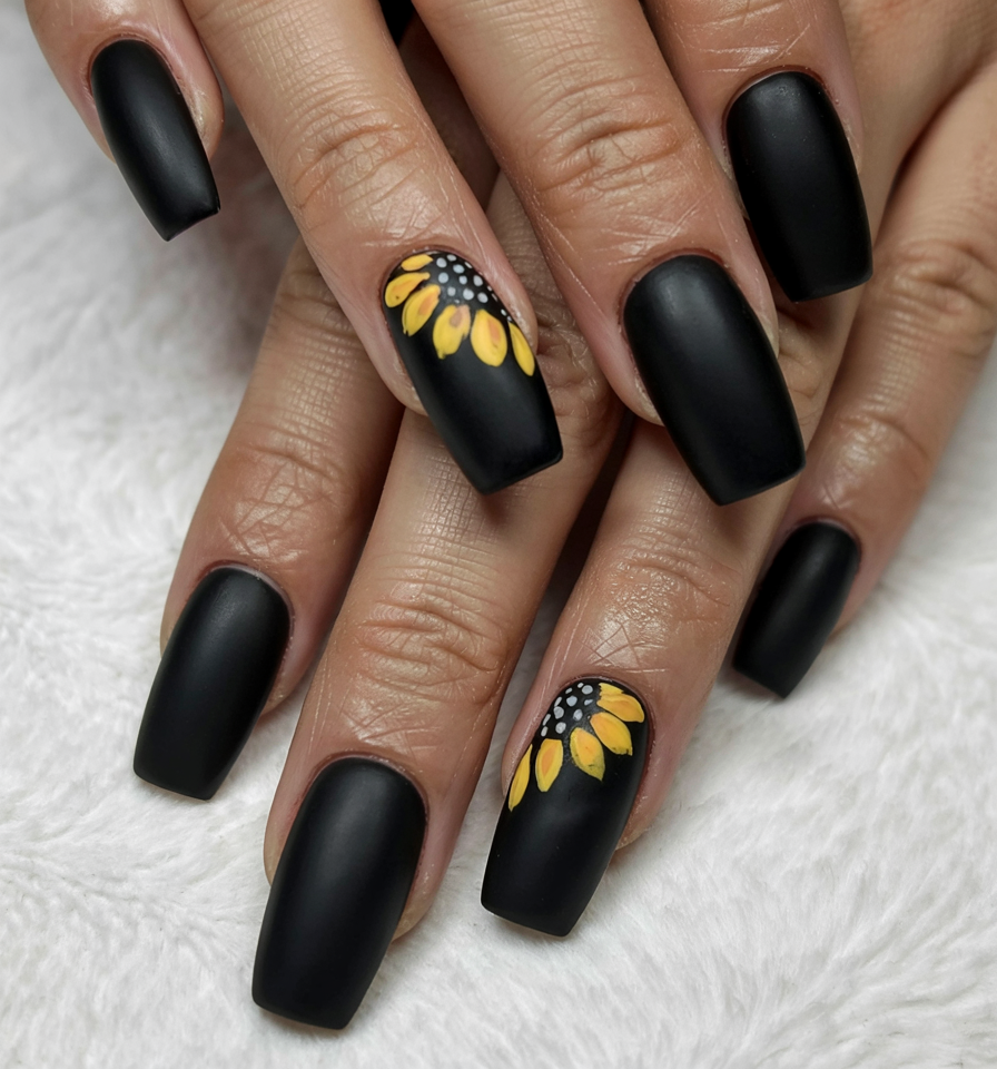 It surprises to see seeded sunflowers on a Matte Black background. It’s a gorgeous contrast—warm meets dark, soft meets strong. These nails remind me of the September afternoons in the beginning of autumn when summer does not still say goodbye, before it finally ends.