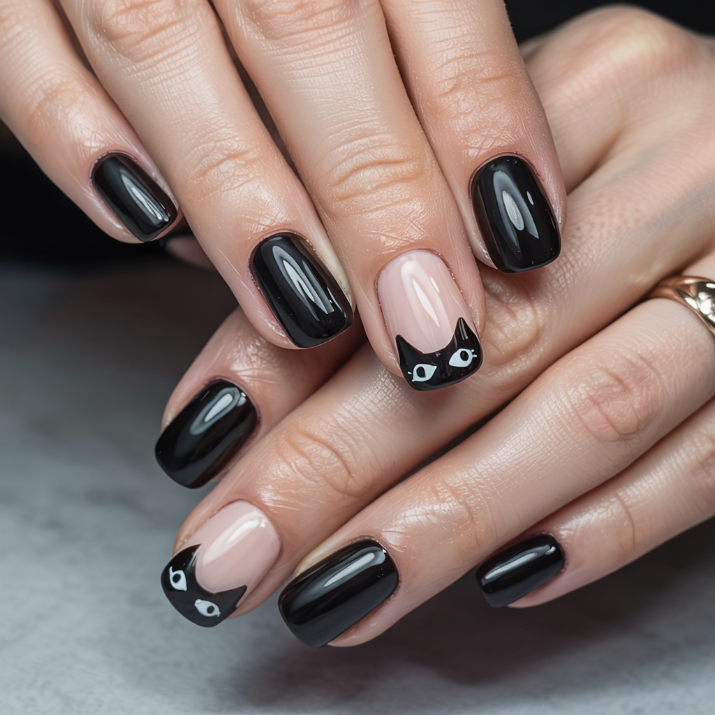It’s subtle Halloween energy at its best. Such sparkly black nails that sport nude color and also have peekaboo black cat faces are so cute that you will just smile upon looking at them. It’s spooky season, but keep it classy.