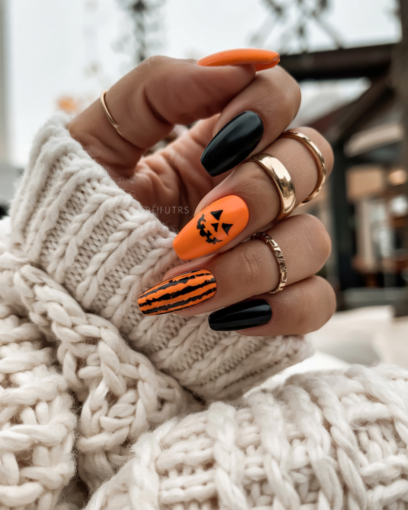 These nails are the pumpkin spice latte of 2025: they are warm, festive and a bit fun. With bold black, juicy orange, and hand-painted jack-o’-lanterns, this design says you’re ready for hayrides, Halloween parties, and cozy autumn nights.