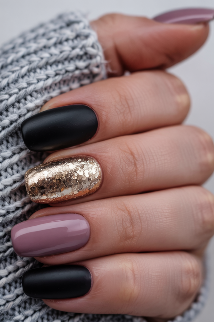 This sulky luxe mix of matte black, dusty mauve and a glam accent of gold is all that fall glam is. It is comfy and fancy, at the same time like cashmere and gold hoops. The black nails anchor the appearance and the gold adds the element of light that you never knew was missing.