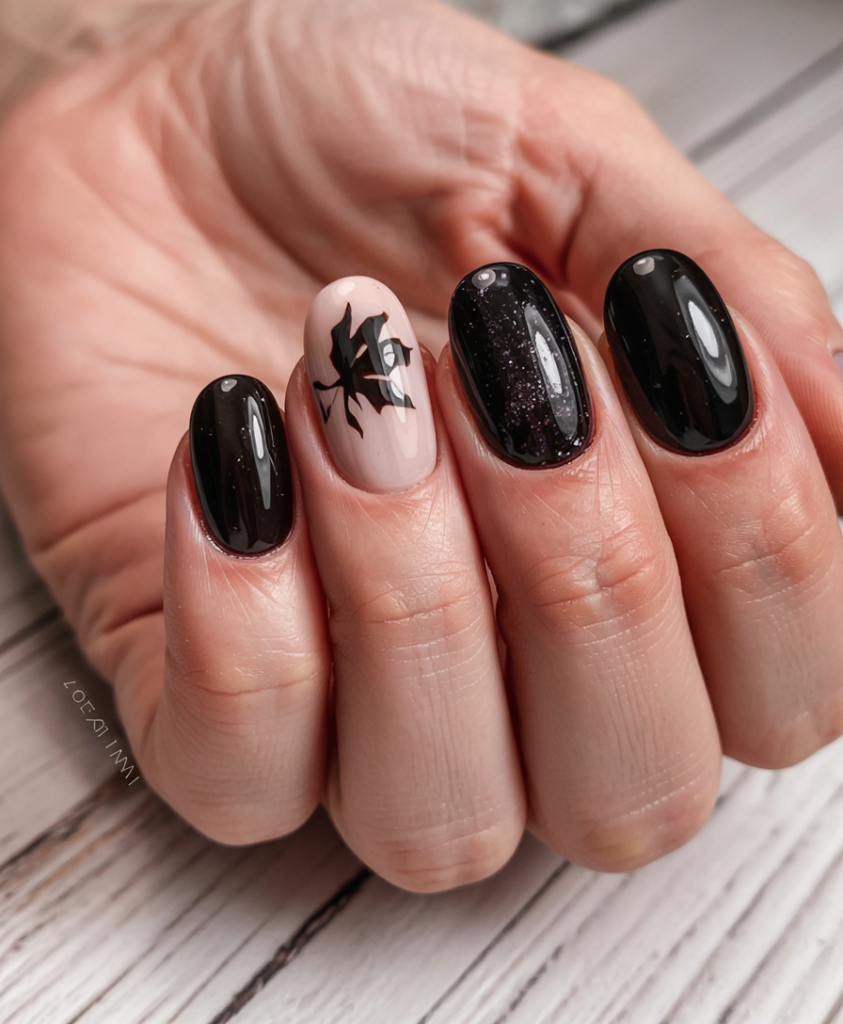 The idea of this mani is soft but dramatic and all poetry that the last leaf of a tree. It looks underwhelming, very much like a hushed gem in the form of a nail. It has a glossy black color, a soft nude base, and only one pure falling leaf detail. It’s the kind of design that whispers, not shouts.