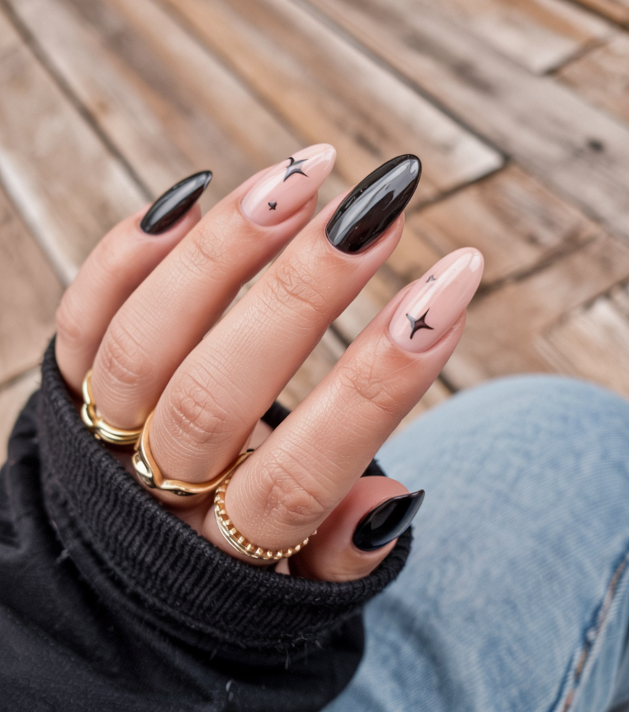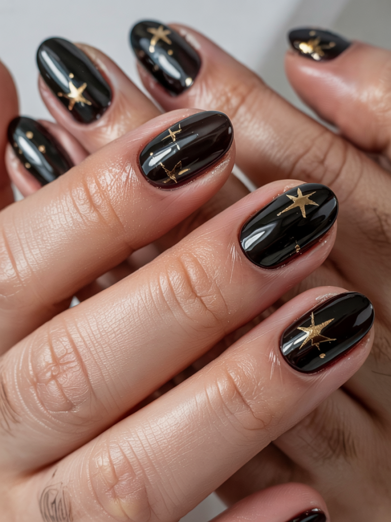 This is a cute style which matches the shorter almond shapes or ovals better. The black matte way-station has a classic design and the gold hues provide a perfect shine. If you’re hunting for inspo that balances elegance with a hint of playfulness, this one nails it.