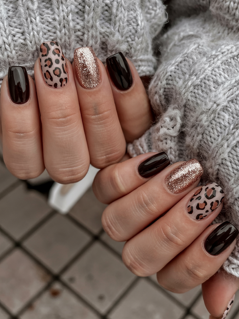 Hello, wild side! This fall nail set does not mind to combine a touch of attitude and glitter. Shiny black ones are combined daringly with warm leopard-spots and glittering, golden-colored, which make the effect playful nevertheless being highly purposeful. It is the type of mani that makes you feel good in an instant – and in your look.