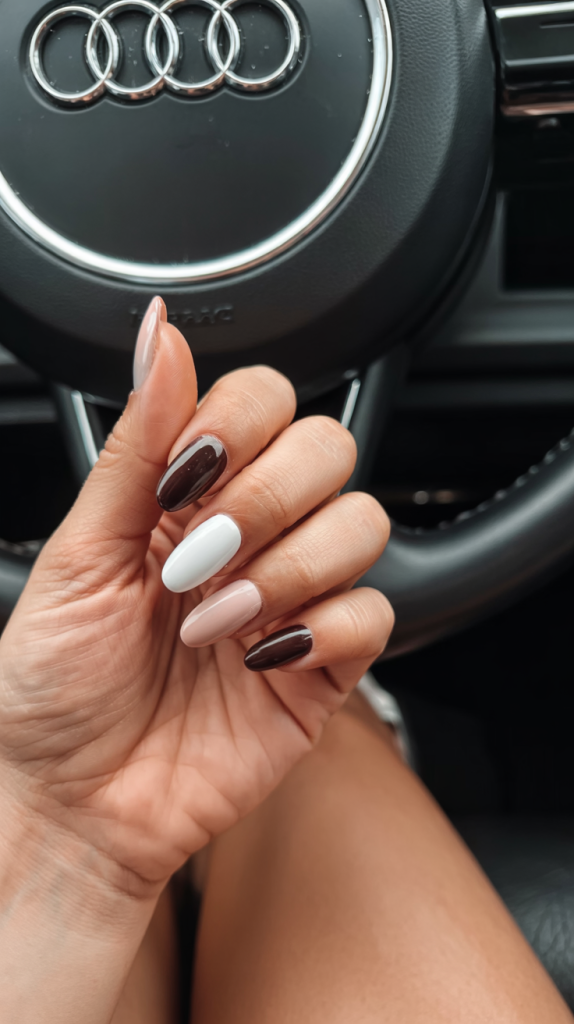 This combo is ideal with coffin shape or square shaped designs and they look good particularly on medium to long length. You prefer a hint of simple and glam? This is your favourite go to in 2025. Also, the matte finish is lenient in between appointments, and the product appears contemporary on all skin tones.