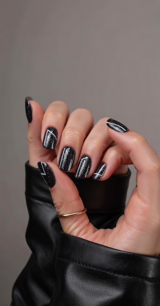 It’s giving stardust, midnight, and mystery—all in one set. These shiny black micro-sparkly nails full of geographical white lines are like constellations in your fingers. They are theatrical, but never over-acted and they are very personal and yet do not shout at you.