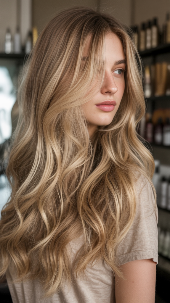 This hairstyle is ideal for women who want blonde highlights on dirty blonde bases to feel fresh and easy. It flatters medium to long lengths, especially when styled with waves to add dimension. A nourishing oil will keep the ends shiny and prevent dryness, making the shade glow even longer.