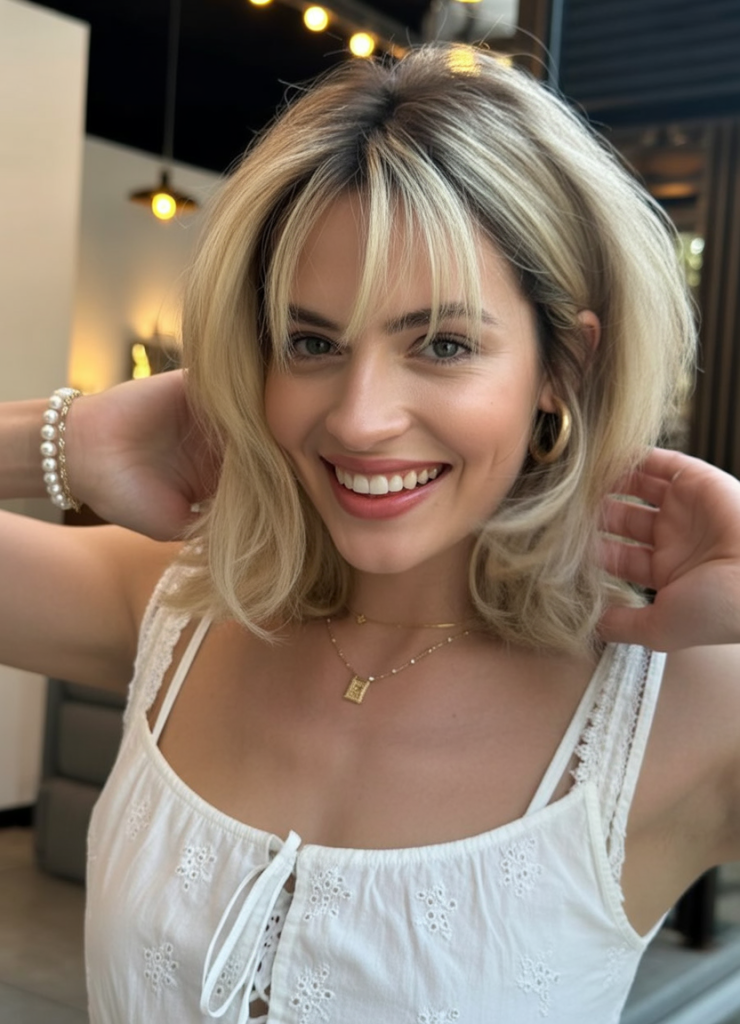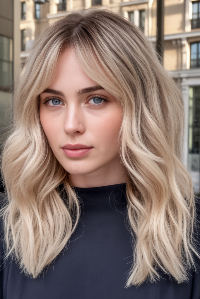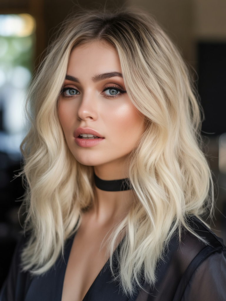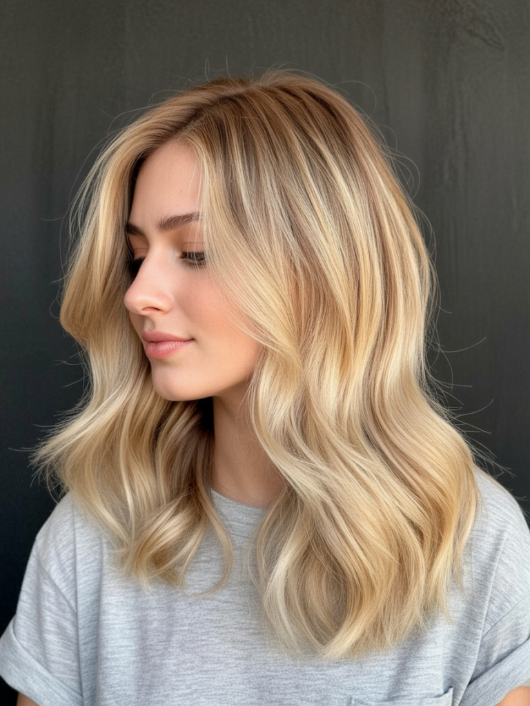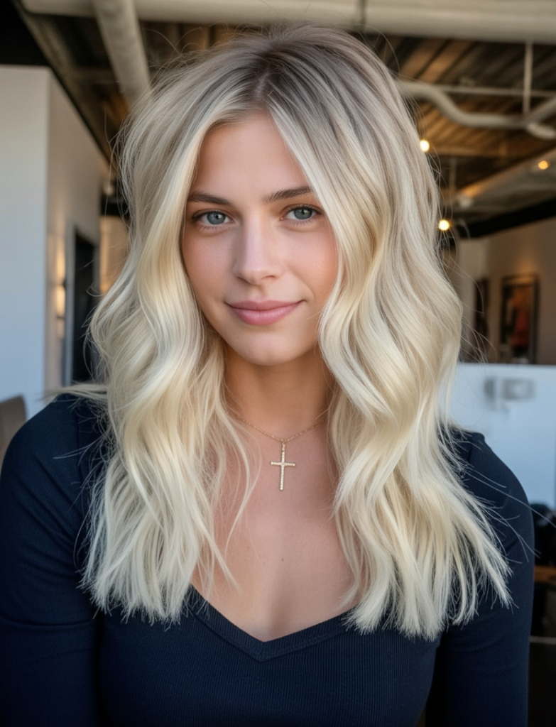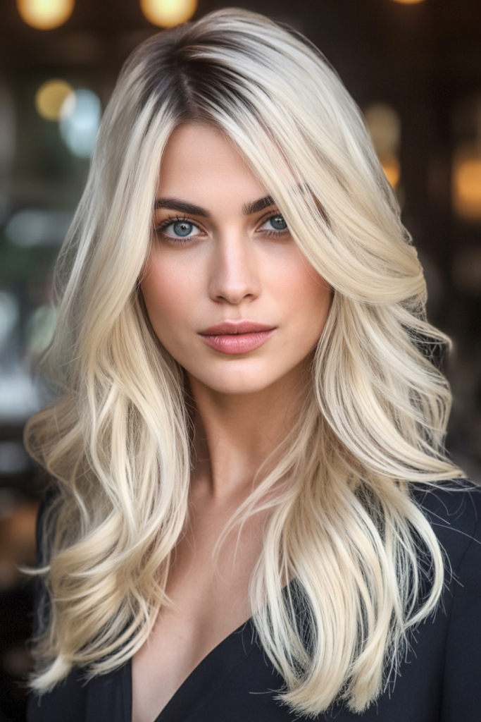 Light blonde paired with soft natural roots has a way of looking effortless and youthful. The balance between brightness and subtle shadowing gives depth, while the gentle waves keep the look approachable. It’s one of those classic blonde styles that never feels out of place.