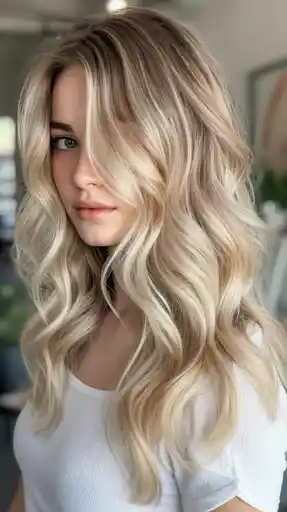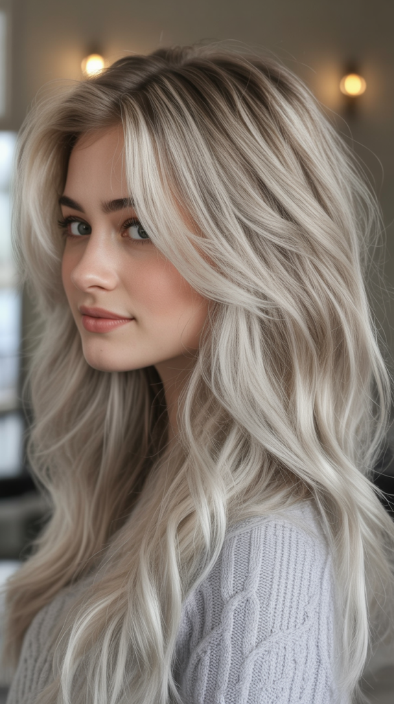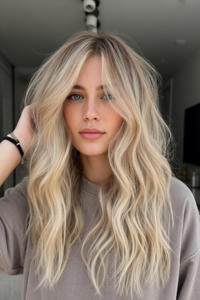 This style works best for women looking for low maintenance ideas that don’t compromise on elegance. The ashy blonde tones soften naturally dark roots, meaning fewer trips to the salon. A texturizing spray is all you need to define the waves, making this a breezy choice for busy mornings.