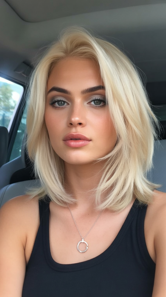 There is something classic about layered platinum hair — it creates movement, glamour, and a young lift to the overall appearance. This haircut frames the countenance in a very flattering manner so that features are stronger and brighter-looking. The light blonde shade reflects beautifully under natural light, introducing that glamorous dimension without appearing overworked.
