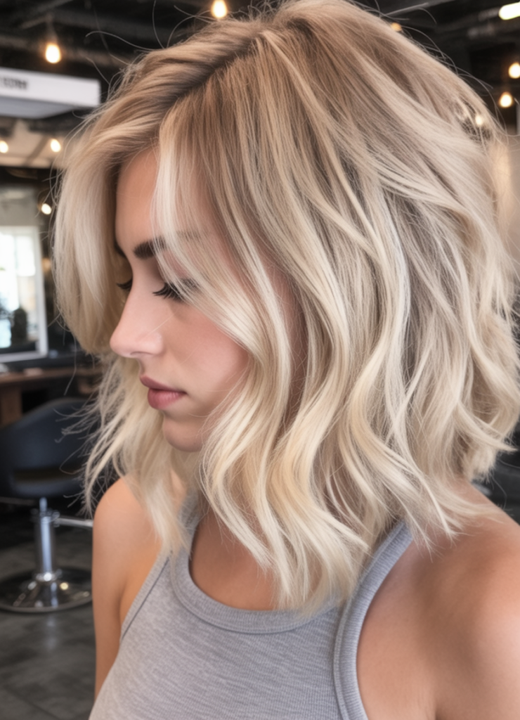 This hairstyle shines on women who love natural yet polished looks. It requires minimal styling — just a touch of mousse or sea salt spray brings out the movement. The beige tone also blends seamlessly with darker roots, making it a practical, low maintenance choice.