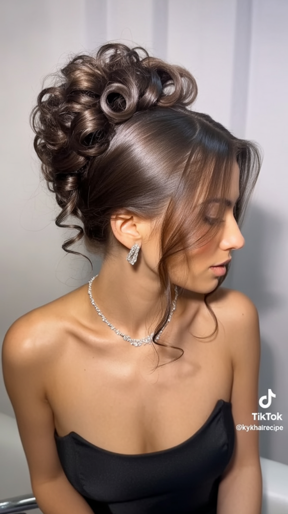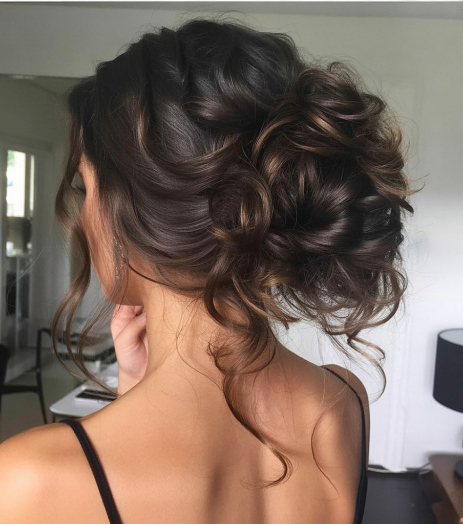 The combination of grace and glamour comes in this classic bun, where a high structured structure drapes down owing to the curls and the encapsulating bangs. The brunette rich colours have some highlights that give depth to the look. It is ideal to wear to a wedding, prom or a black tie event, where it will make an impression and is sophisticated at the same time.
