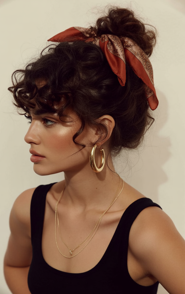 This bun is perfect to work with already curly, and can be made in a jiffy by pilling the curls up high and pulling into place. The scarf will not only contribute to the fashionable look but will also help keep the bun where it belongs, i.e., it is convenient and fashionable.