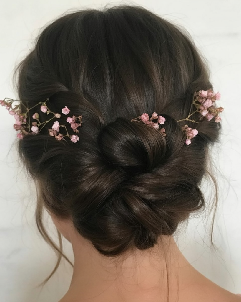 This is the perfect hairstyle on medium or thick hair because it looks beautiful when prepared using a light-hold hairspray. The floral pieces may be actual or imitation, and the pieces would provide immediate glamour to a bride, the bridesmaids, or a guest to a garden party.