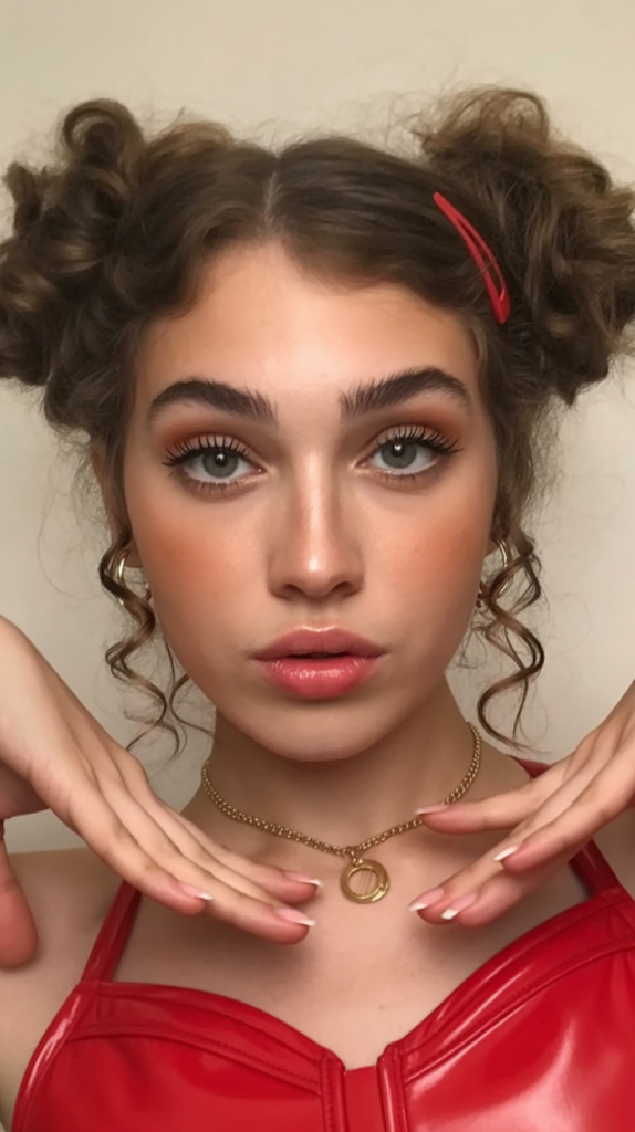 These big playful space buns are rendered downright adorable by means of defined curls and a lubberly, face-framing quality. Having a red hair clip is also a fun way of adding color and character to this outfit which would make it the most suitable outfit on an informal outing or themed occasion.