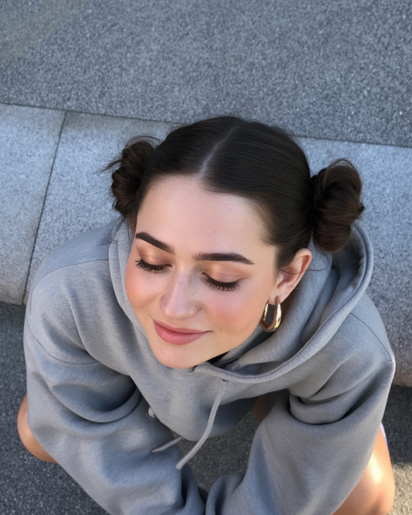 Sleek center part and smooth tight buns will show a fresh modern flair to these minimalist space buns. This subtle class of the dressing can be applicable both as street looks and casual brunches.