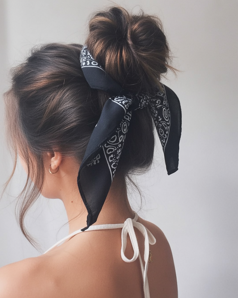 The front part of this messy bun is simple but at the back, a bandana bow has been tied to give it a playful update. The free ends and untidiness of structure leave it casual and relaxing, whereas the bow gives the plan a fun bohemian vibe that is ideal to be worth the warm afternoons.
