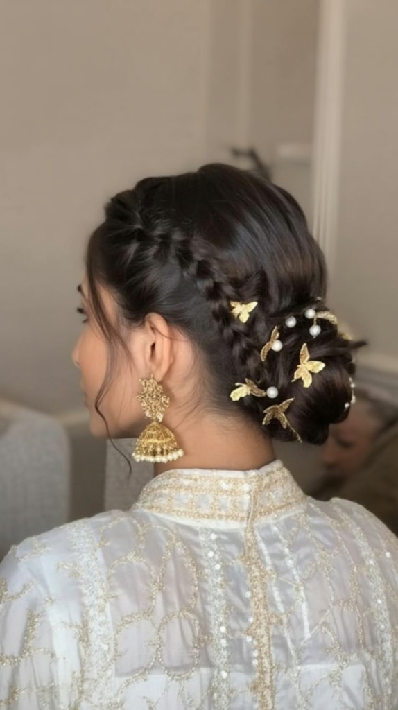 This elegant plaited bun is made to look superb with extremely decorative pearl and gold dentals giving it an elegant and royal finish. It has a perfect weddings, cultural celebration or formal event since the braid brushes into the bun without any complications. The decorations add luxurious, bespoke finishes where this style stands out.