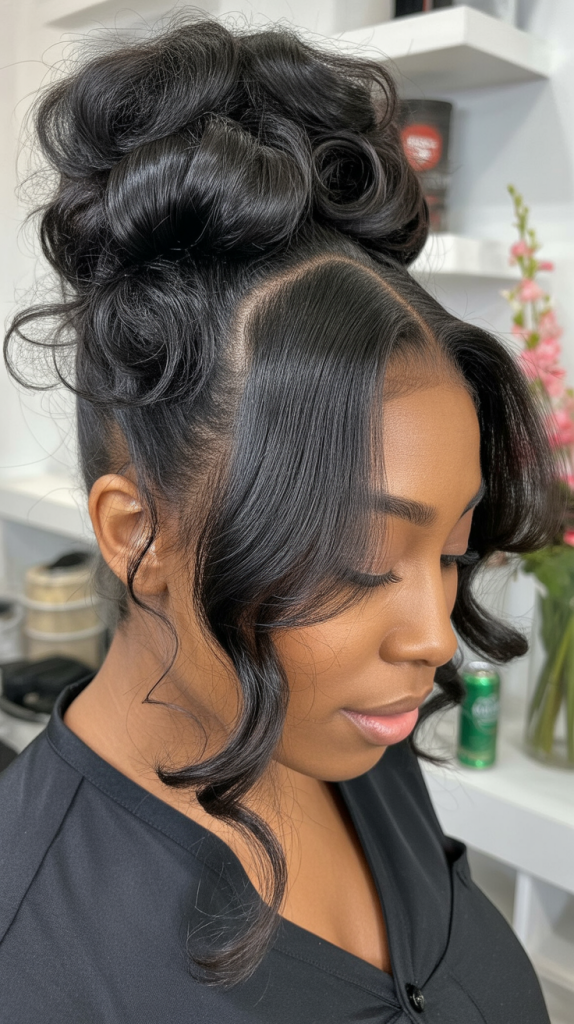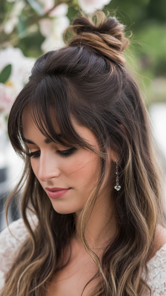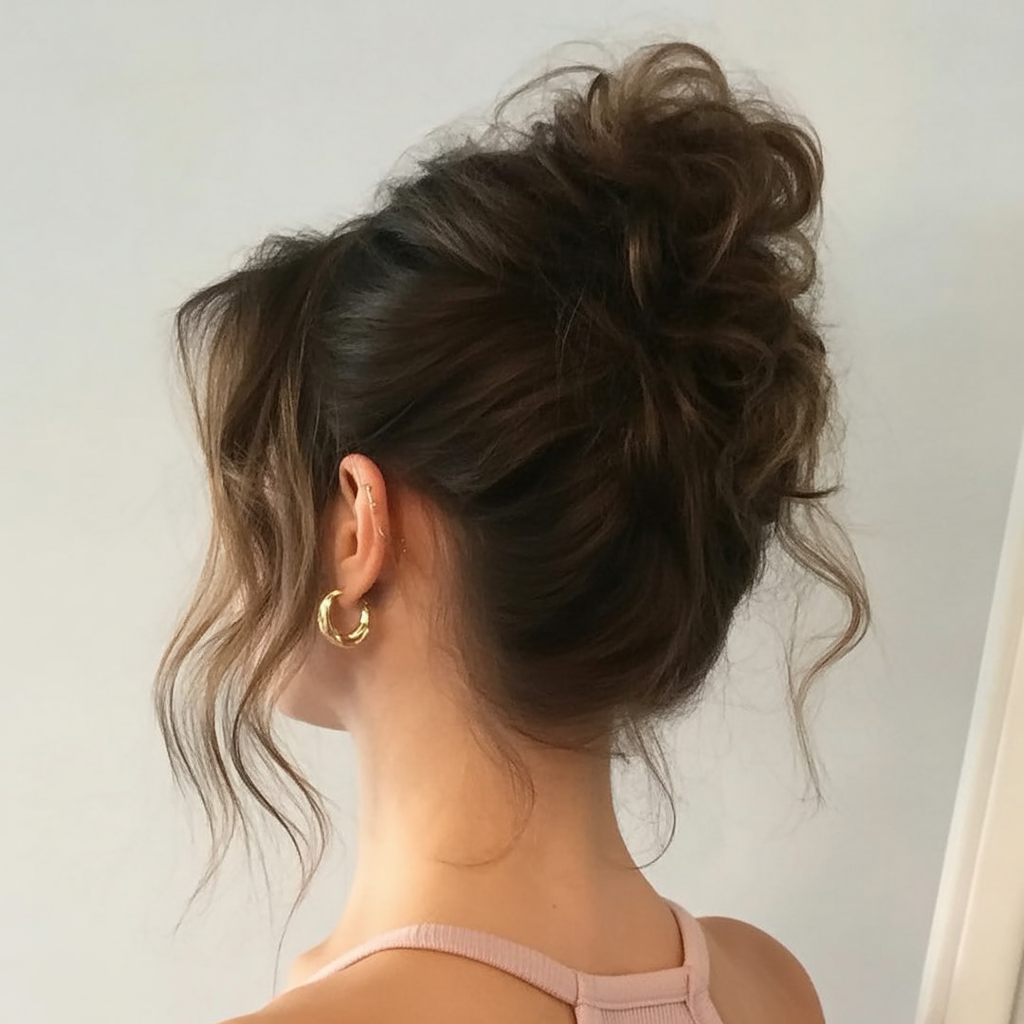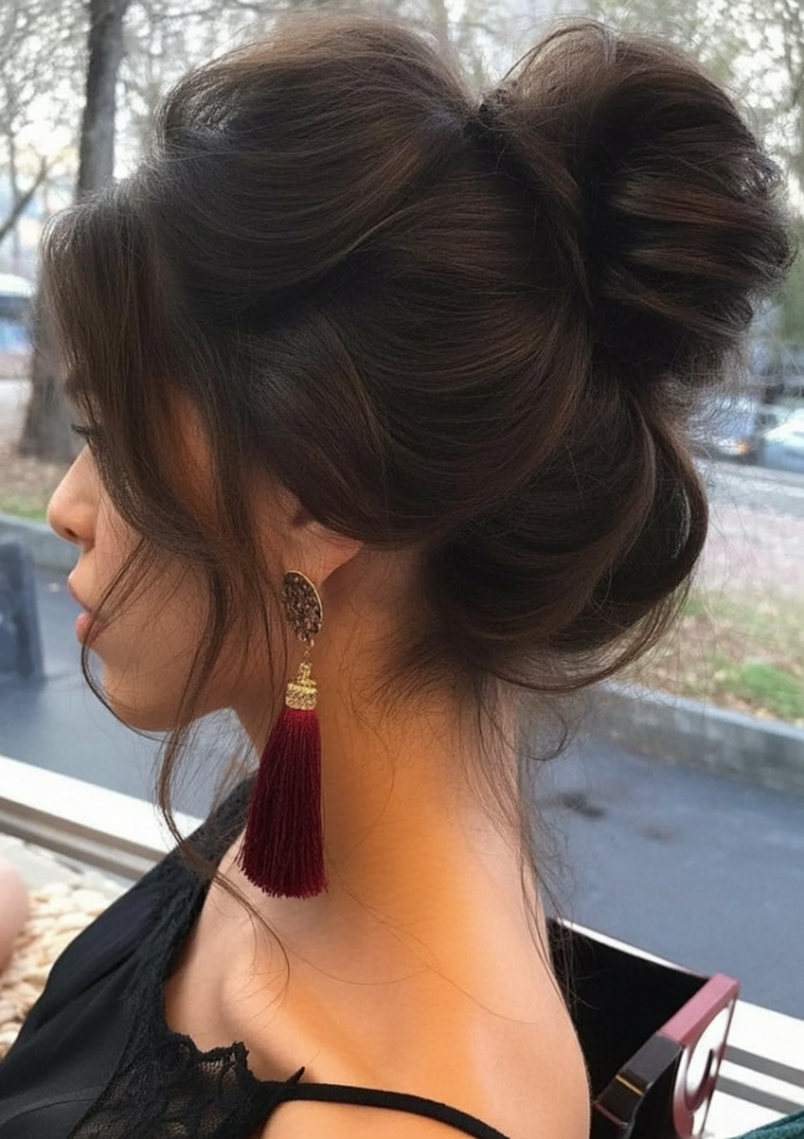 This bun is great when the hair is long or has an extension, light teasing and soft pinning at the top will keep it the best. Some loose strands that curl loosely around the face create balance, and it is a particularly beautiful choice of those who become bride or simply those who would like to feel a part of romance in 2025.