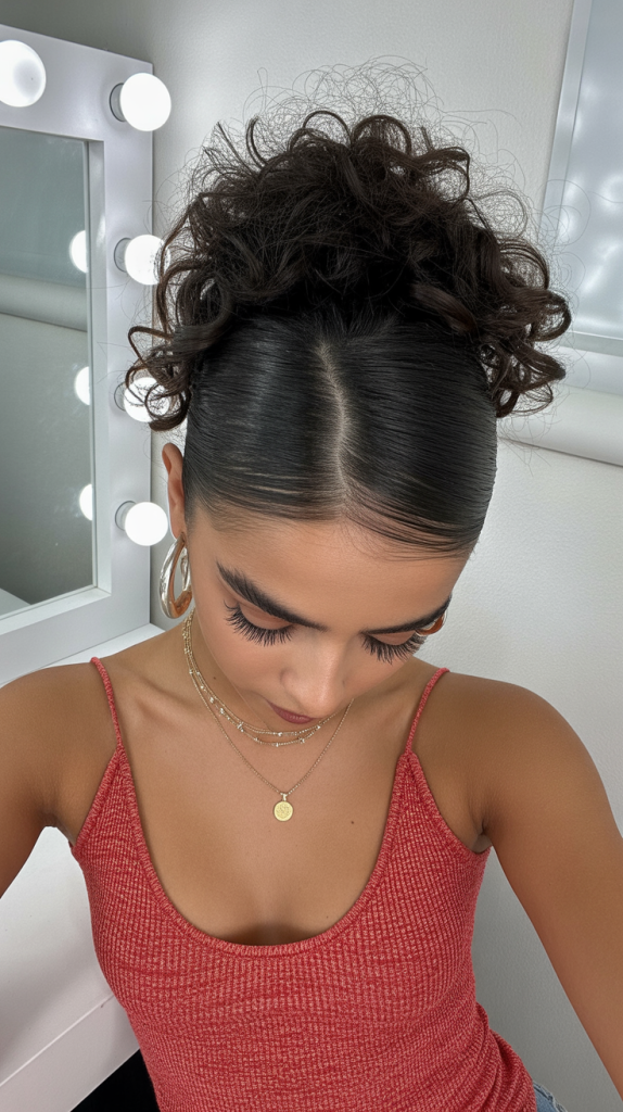 This playful curly high bun practically sparkles with personality. The described tendrils that gently cascade along the face emphasize the eyes and cheekbones as an addition of some flirtiness. It is an ideal summer style at a party, during a vacation or any other time when you feel you want your hair to symbolise your outgoing personality.