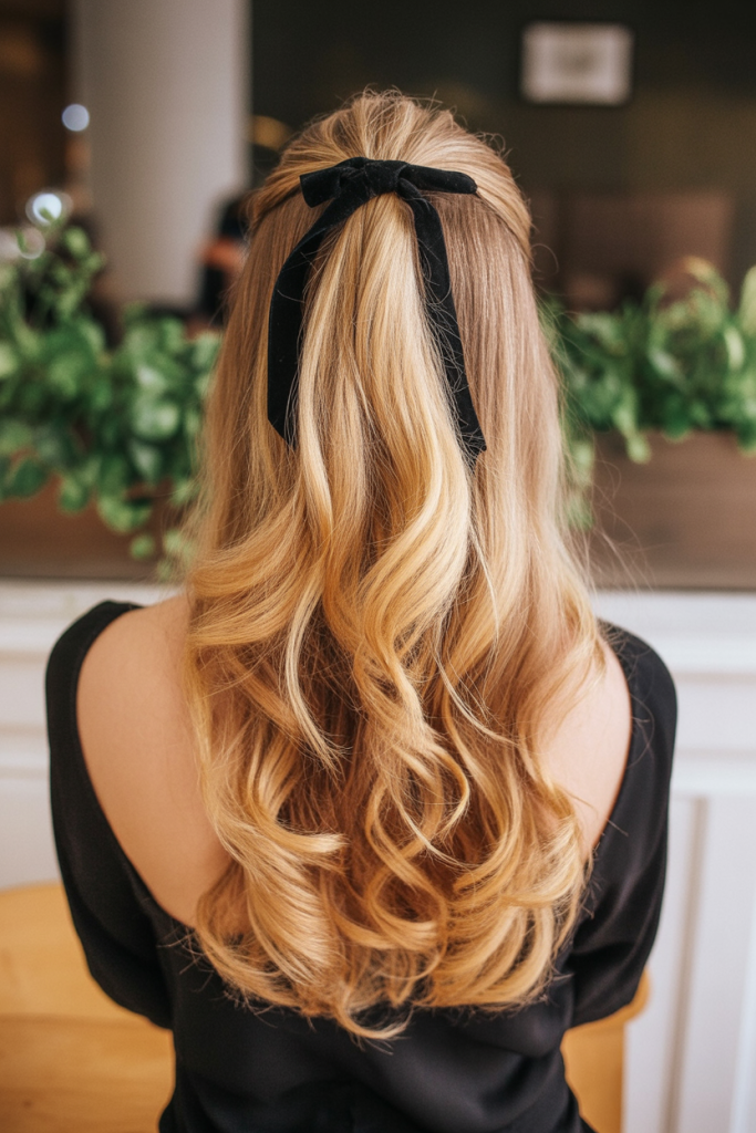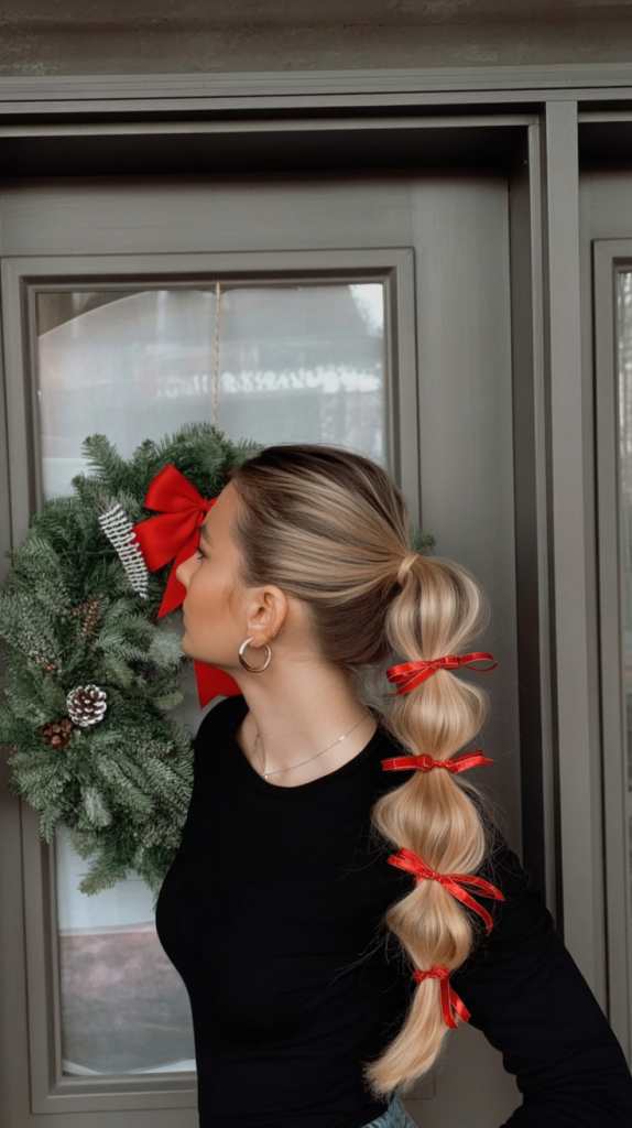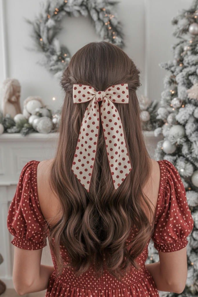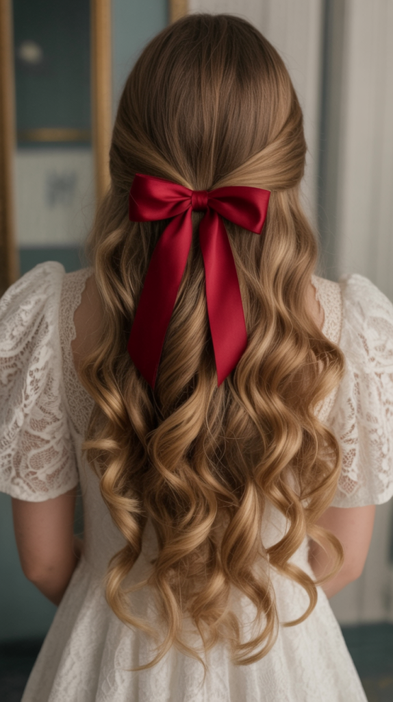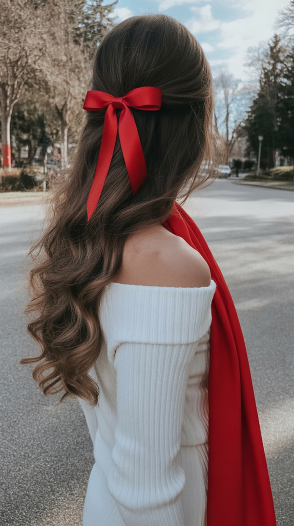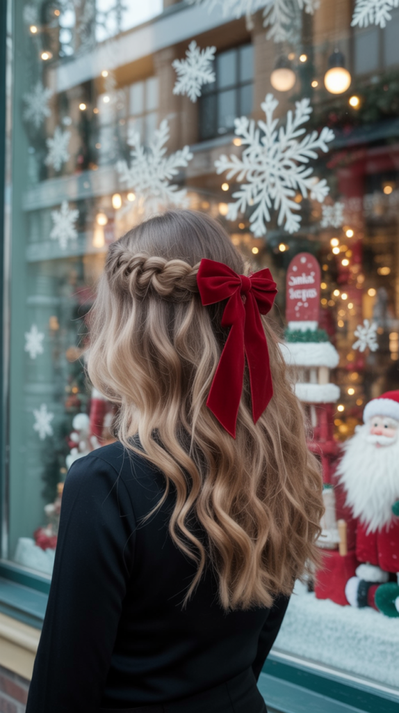 This half-up style tied with a sleek red ribbon is all about classic holiday romance. The soft curls cascade down, providing the bow with timeless charm. It’s one of those hairstyles that immediately bring to mind holiday-time movies and candlelit evenings, giving any wearer a sweet, feminine aura.