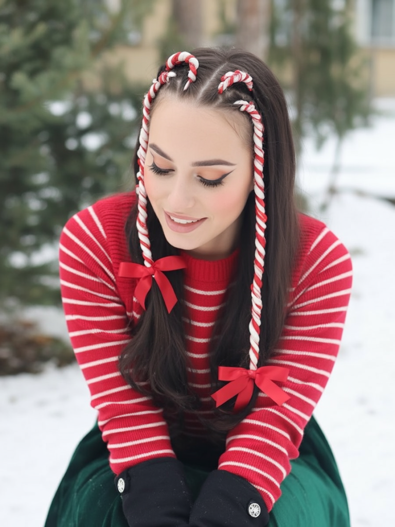 There is nothing more stunning than these braids wrapped in candy stripes. With little red bows crowning the ends, this hairdo spells pure Christmas magic. It is bold, playful, and, in the best way possible, seems like a holiday costume come to life.