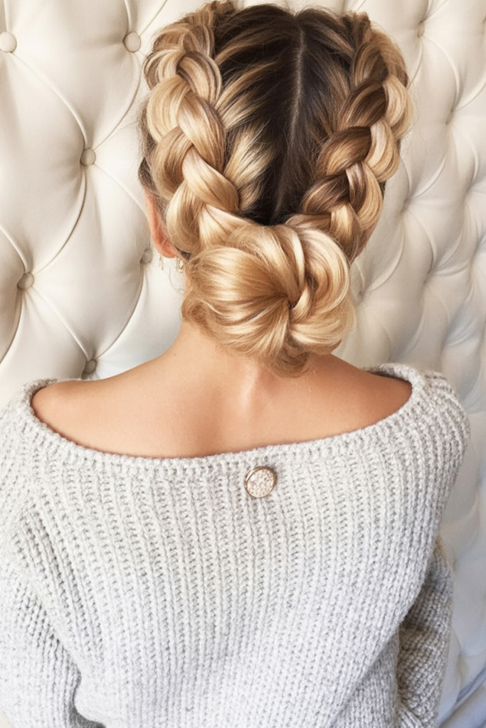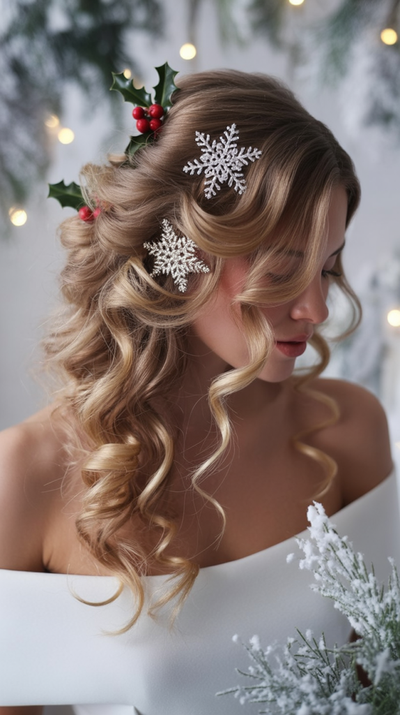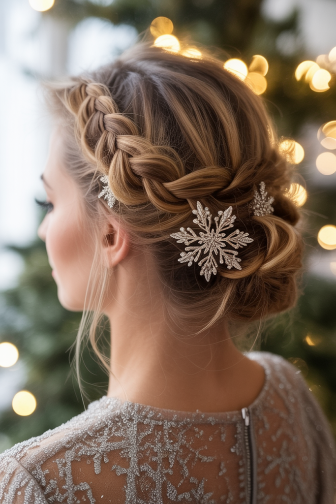 This braided updo feels like a fairytale brought to life, with snowflake clips catching the light just like frosty windows on Christmas morning. It’s elegant, regal, and carries a quiet kind of glamour that makes you feel polished without being overdone. Perfect for holiday dinners or New Year’s Eve, it instantly elevates any outfit with a magical touch.