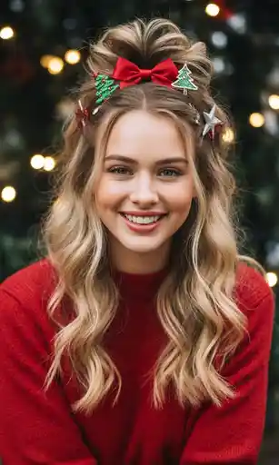 This half up-do is decorated with bows, stars, and tiny Christmas tree clips to give it that spark of holiday cheer. Curls keep it lively and fun while the accessories handle most of the festive part.