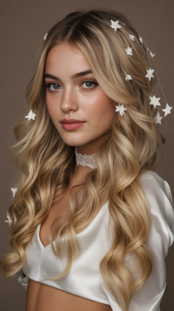 Soft, cascading waves adorned with delicate star clips produce a dreamy and celestial styling. Ideal for a Christmas Eve or New Year’s party, it mixes romance with just a dash of enchantment. The stars glimmer against blonde hair, transforming it into a holiday fairytale.