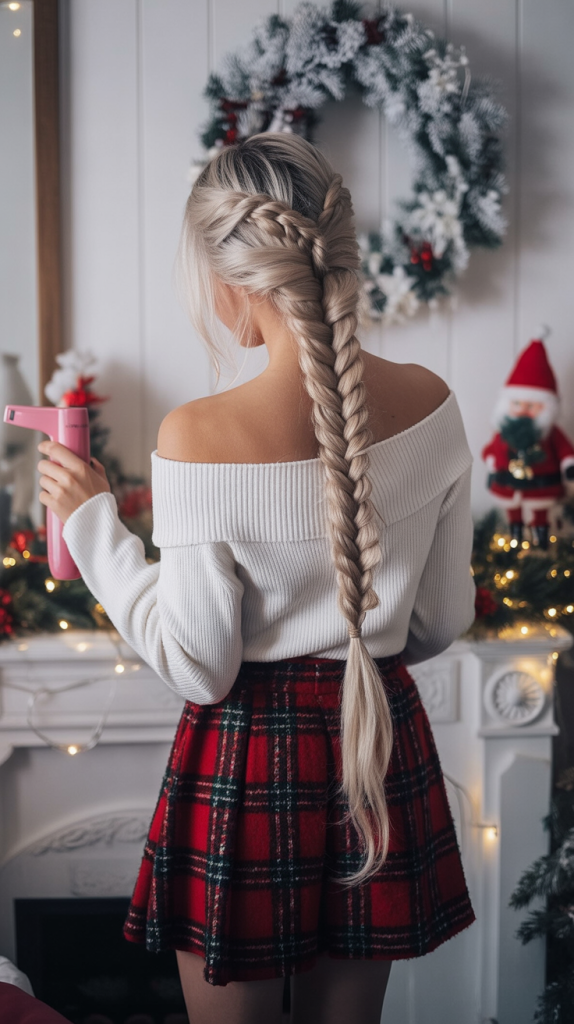 Something about the look of a loose braid paired with a bold red ribbon just feels very Christmasy. The crown braid gently frames the head, while the waves drift down with what feels like a winter song. The velvet bow makes it all a holiday statement-a statement that will make you feel like the center of the Christmas celebration. It’s charming, slightly romantic, and very much in tune with the joy of the season.