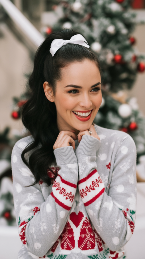 A formal high ponytail that’s given a holiday zest thanks to the touch of a white bow. It’s a simple style yet chic, striking an appealing balance between casual fun and polished charm. A swift go-to for holiday styling that doesn’t look like you barely made an effort.