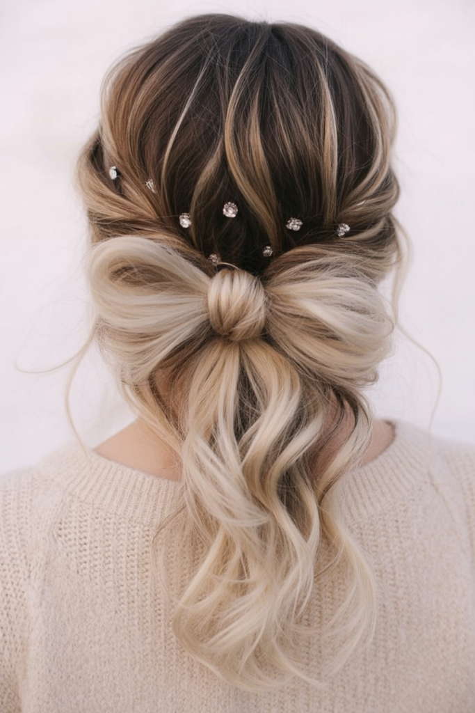 3. Soft Bow Ponytail with Crystal Accents